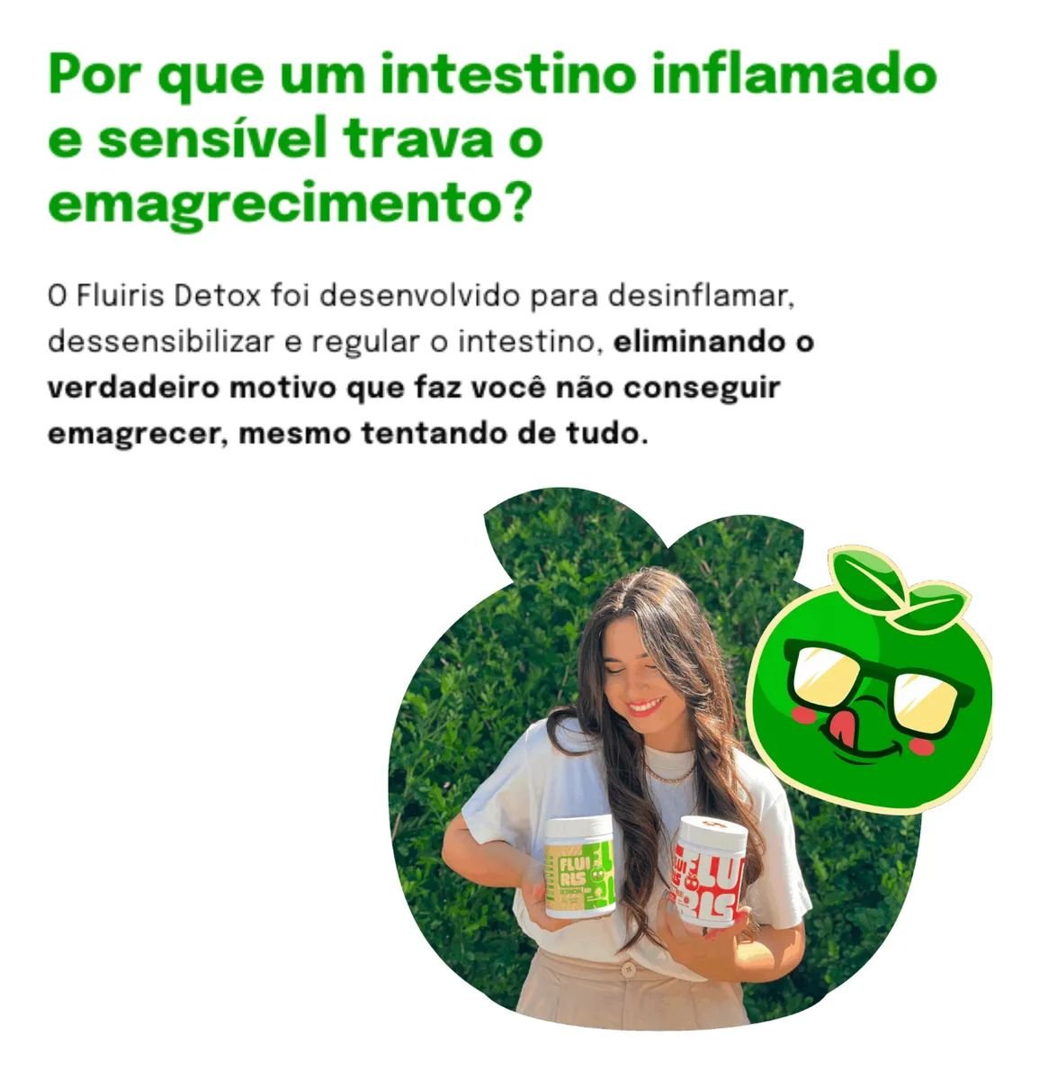 DESINCHA-O Fluiris Detox age desinflamando o intestino, eliminando toxinas, reduzindo o inchaço, regulando o intestino e dessensibilizando seu corpo para que ele pare de reagir mal aos alimentos e volte a funcionar do jeito certo.